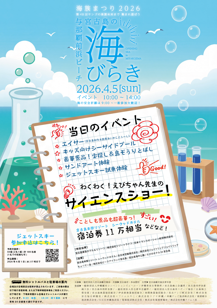 東洋一の真っ白い砂浜と透き通る宮古島の美しい海を島内外にアピールし、海の安全祈願を行う事を目的として今年も海びらきを開催します。